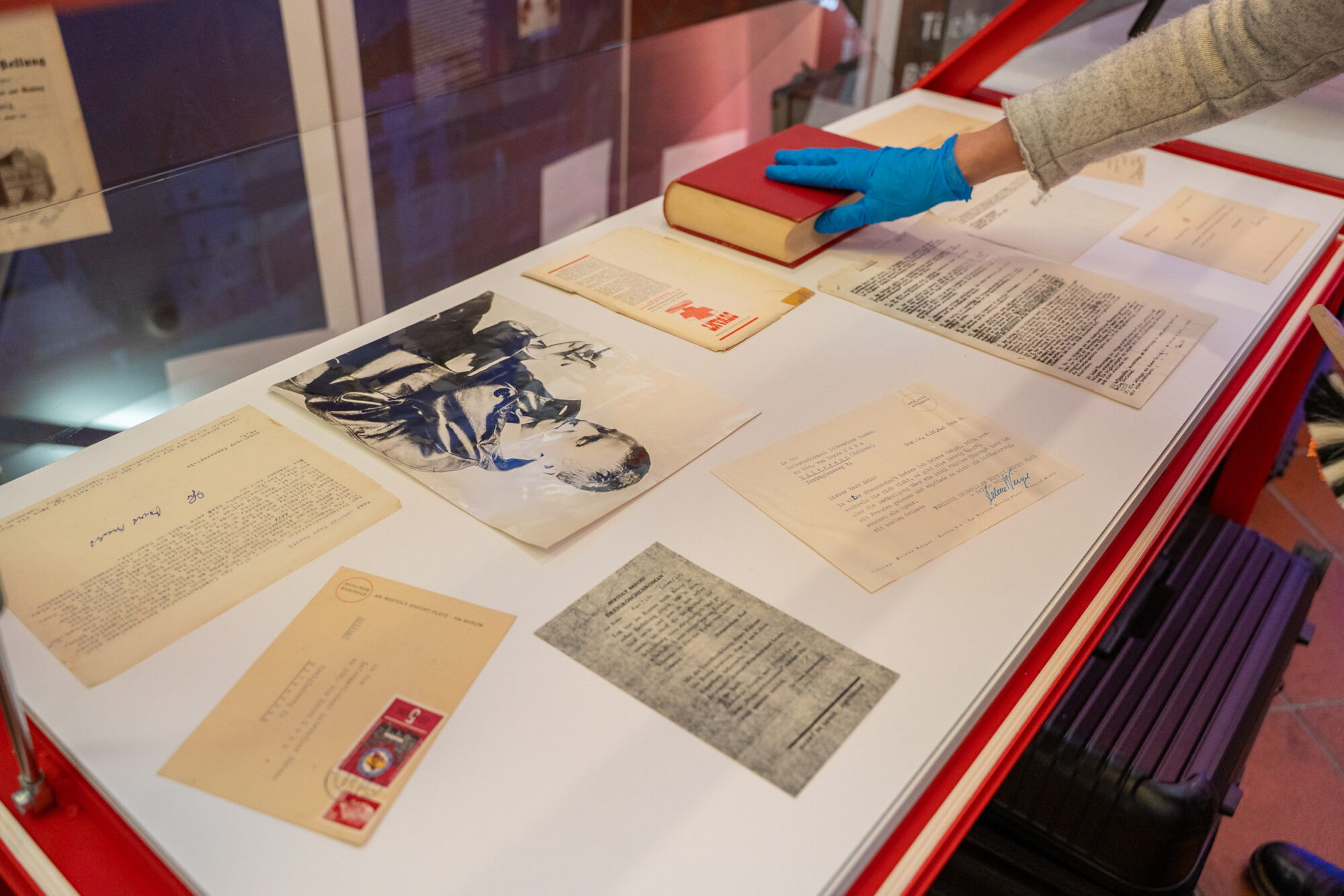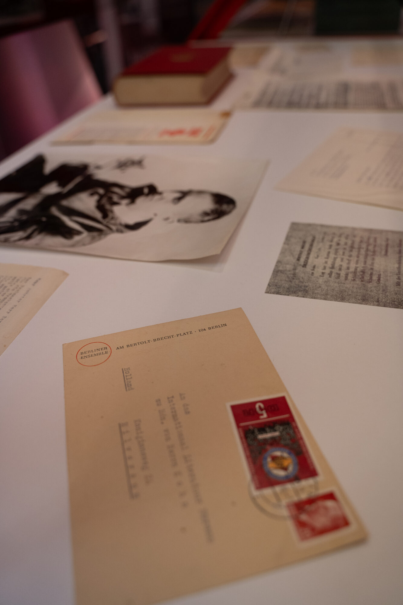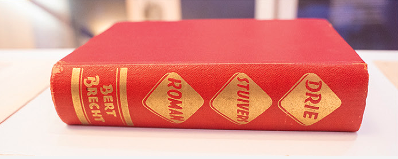 Hier sehen sie Originalobjekte zu Bertolt Brecht. Es werden persönliche Briefe, Telegramme, Geschäftskorespondenz und der Dreigroschenroman im Niederländischen Original gezeigt.